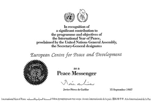 The European Center for Peace and Development (ECPD) was awarded the Peace Messenger Award by the United Nations Secretary General, in recognition of its significant contribution to the programme and objectives of the International Year of Peace (1987), proclaimed by the United Nations United General Assembly.